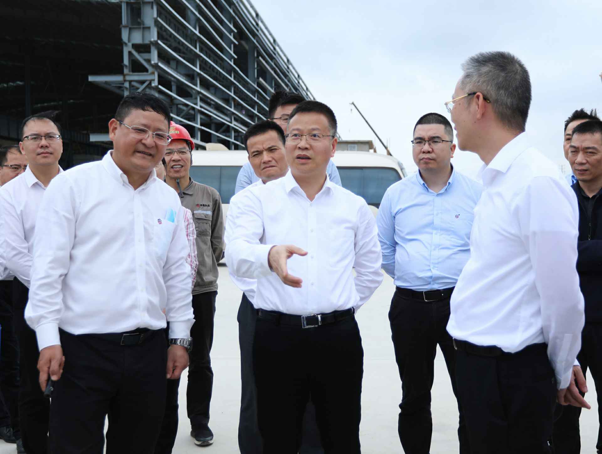 在宁波俊豪环境保护有限公司厂区内,谭丕创走进多功能展厅、热轧生产车间,实地考察了解企业生产运营总体情况、产业规划发展、园区建设、重大项目推进、技术改造等情况。